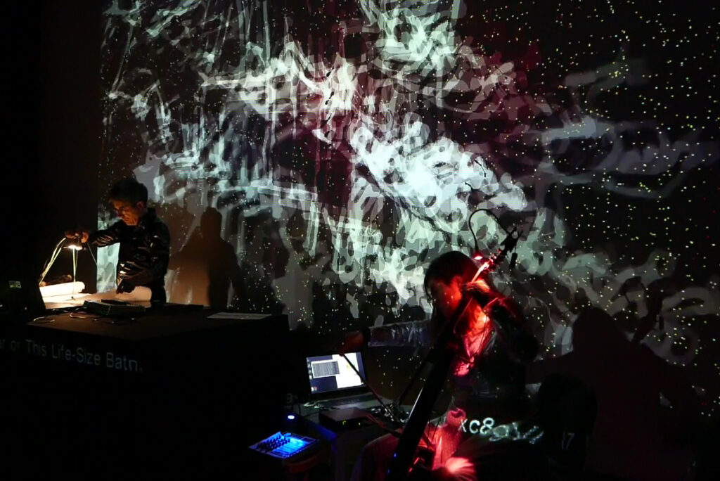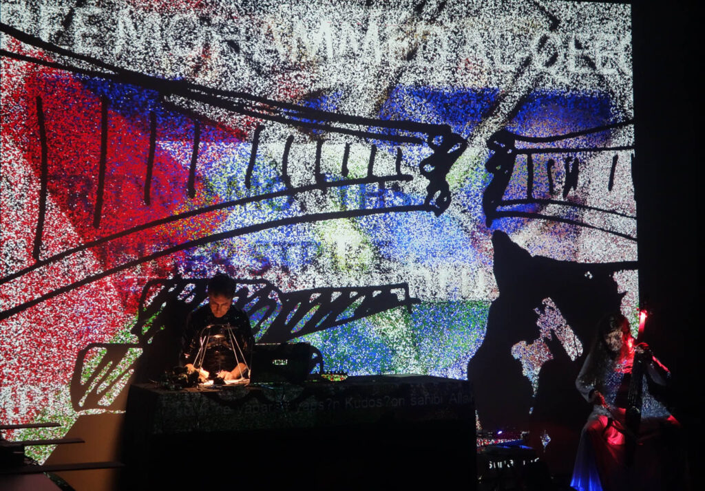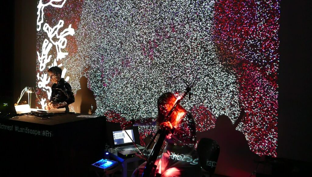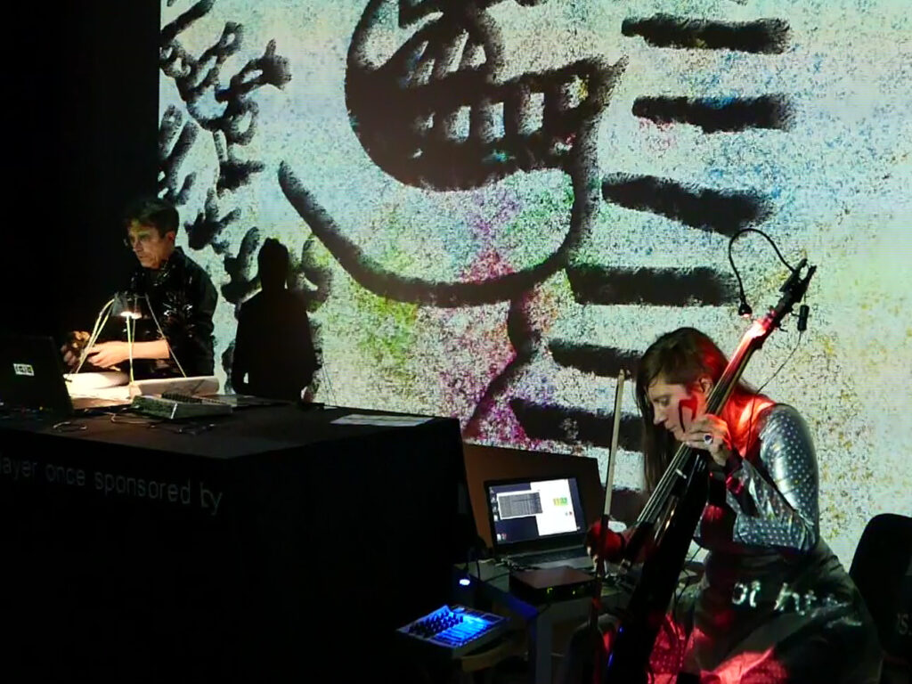 terrains vagues wandering is an audiovisual performance with live electric cello, speech and sound samples, performative drawing augmented with digital effects and the manipulation of a bonobo toy. The project is based on the collection of tweets sharing common hashtags. It illustrates the harmful effects of spread of ideas in society. On these information wastelands, the performance offers an audiovisual poetry made of despaired cello laments and performative drawings about the dystopian social pressure. The bonobo toy shares the graphics scene, sacrifices its fragile innocence of endangered species and mirrors our own vulnerability.