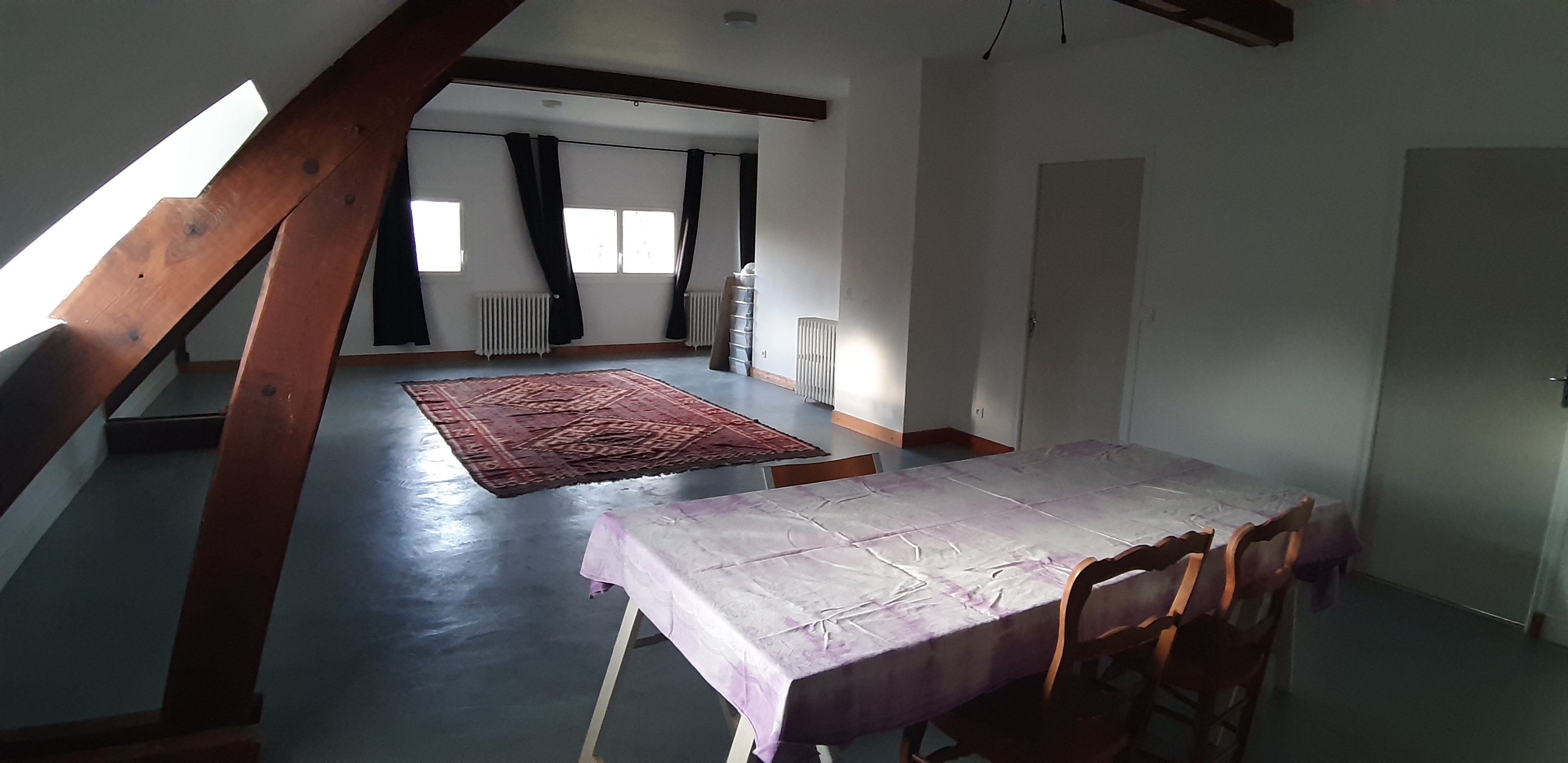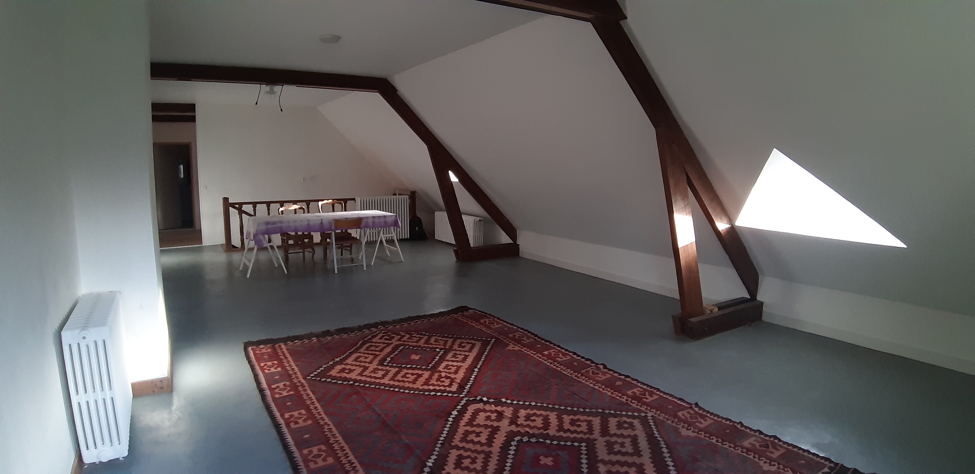 On the first floor you also find the big 70m2 residency workspace for creation, that can be used from 8AM to 10PM. The residency workspace has a sloping wall and concrete floor and is therefore not so suitable for more than 1-2 dancers, depending on what space they need.