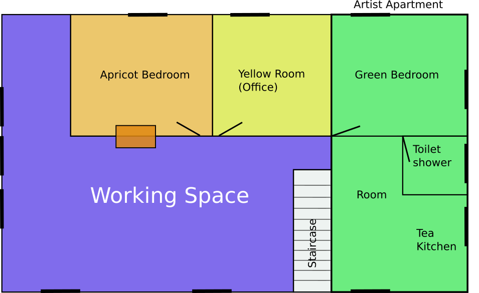 On the first floor you find the little two-room artist apartment (green bedroom) with own bathroom/toilet and a tea-kitchen, that can host up to three single beds. Furthermore, there is additional bedroom with two single beds (apricot beedroom).