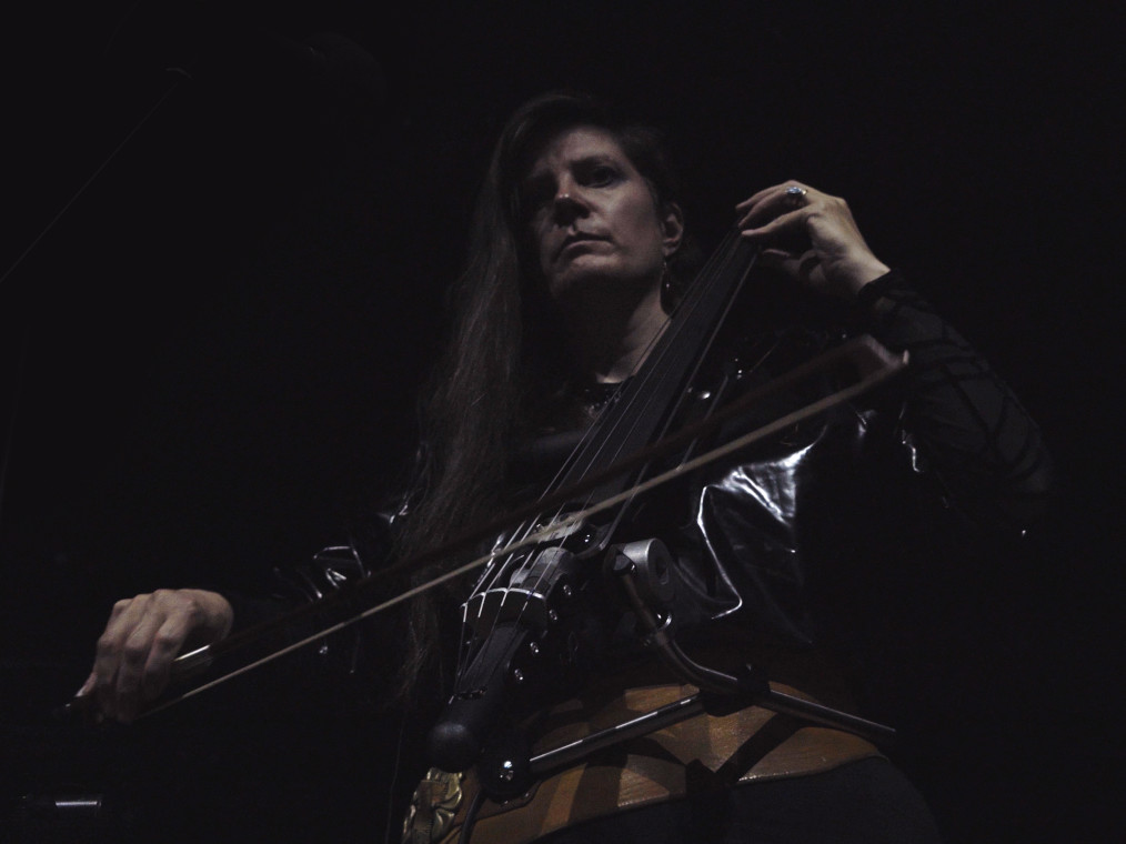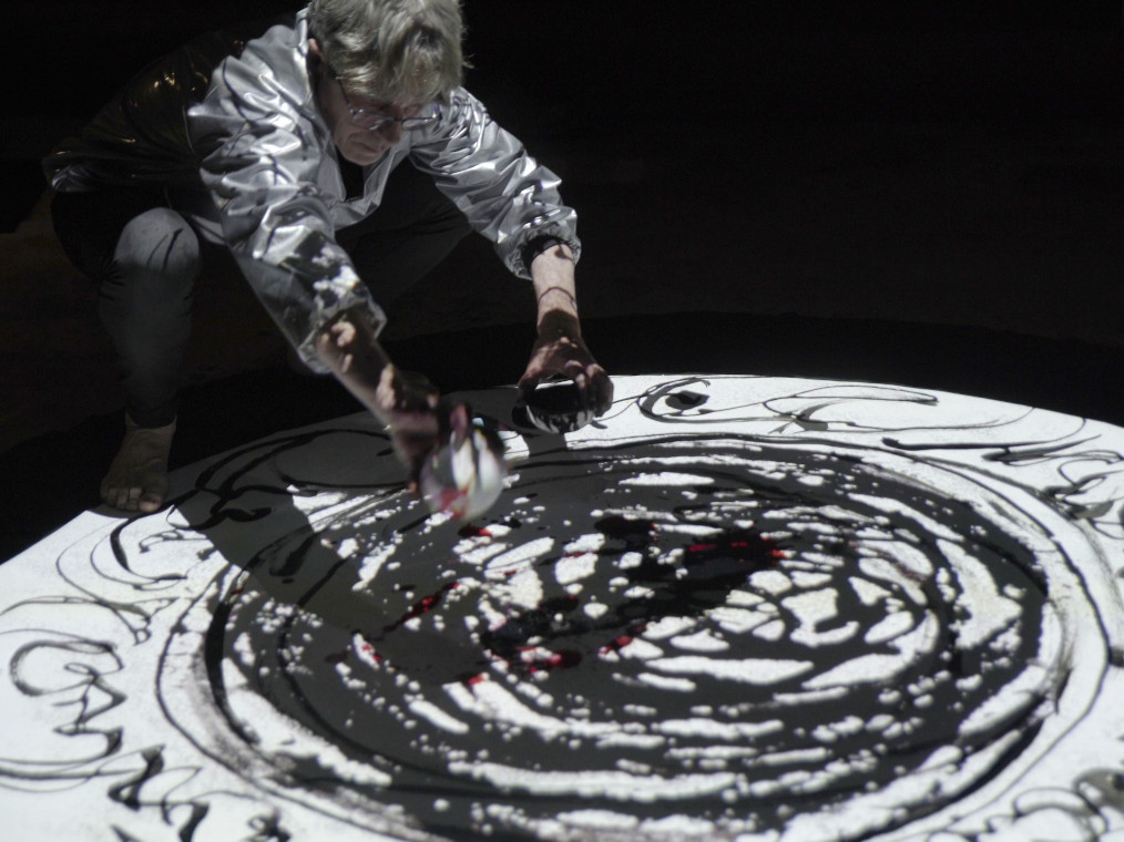 Völuspá is an unusual audiovisual performance. It is inspired by a dramatic Nordic tale that describes the birth of the world, its violent destruction and out of the chaos a world is born anew. The octophonic electroacoustic composition, combined with the expressive lamentations of voice and cello, surrounds the audience in a soundscape. The video projection on a circular surface on the floor is at the center of the audience. Digital painting mixes with performative ink and drawing. The images, both digital and analog, and the immersive sound composition plunge the audience in a primitive ritual evoking ancient ceremonies in a circle around a fire.