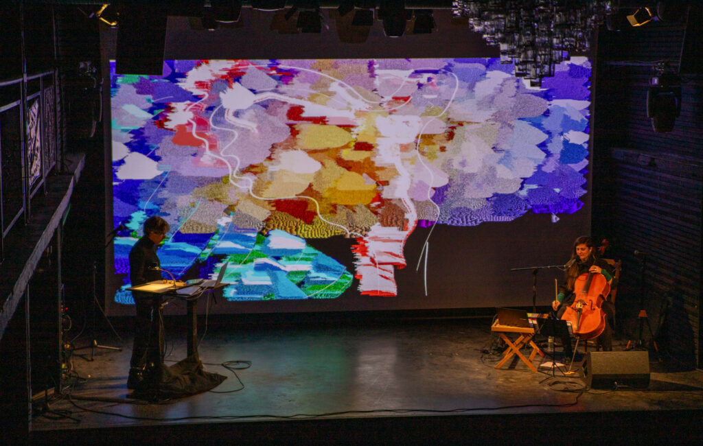 Pixels pulsate, multiply, collide, and swarm in generative nights, an audiovisual “exploration of an underground world hosted by micro-organisms that infinitely replicate” created by Lola and Yukao Meet, the duo comprised of composer Lola Ajima and graphical artist and scientist Yukao Nagemi. Inspired by cellular automata, the graphical and audio patterns of their video collaboration are meant to spark the viewers’ imaginations with images of “industrial halls, cities at night or a biologist’s lab bench,” according to the artists.